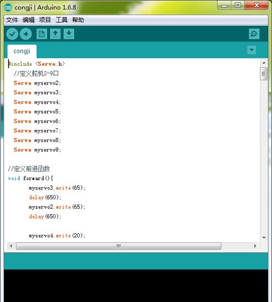 在编译软件IDE中打开素材中的“zhuji” 程序,可将程序上传至遥控器开发板,通过编译软件上的串口监视器来演示,打开“congji” 程序观察接收到不同字符时机器人相对应的运动。